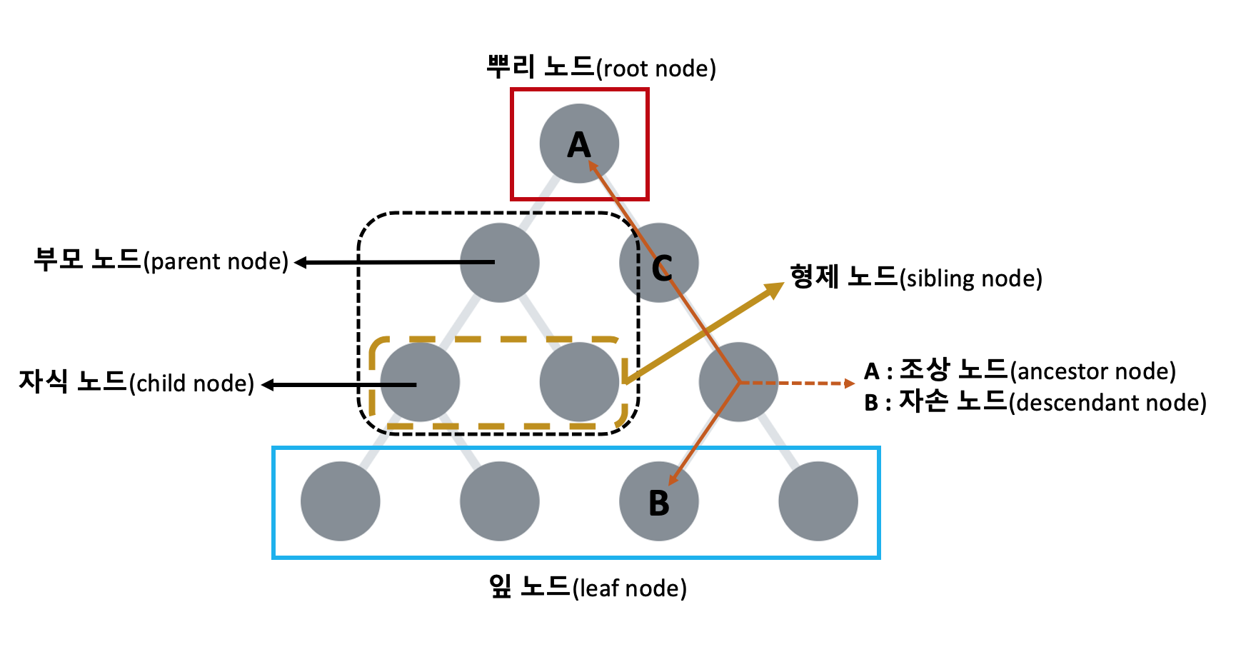 그리고 비선형 자료구조의 대표적인 유형인 이진 트리(Binary Tree)를 각 노드의 명칭을 알아보자.